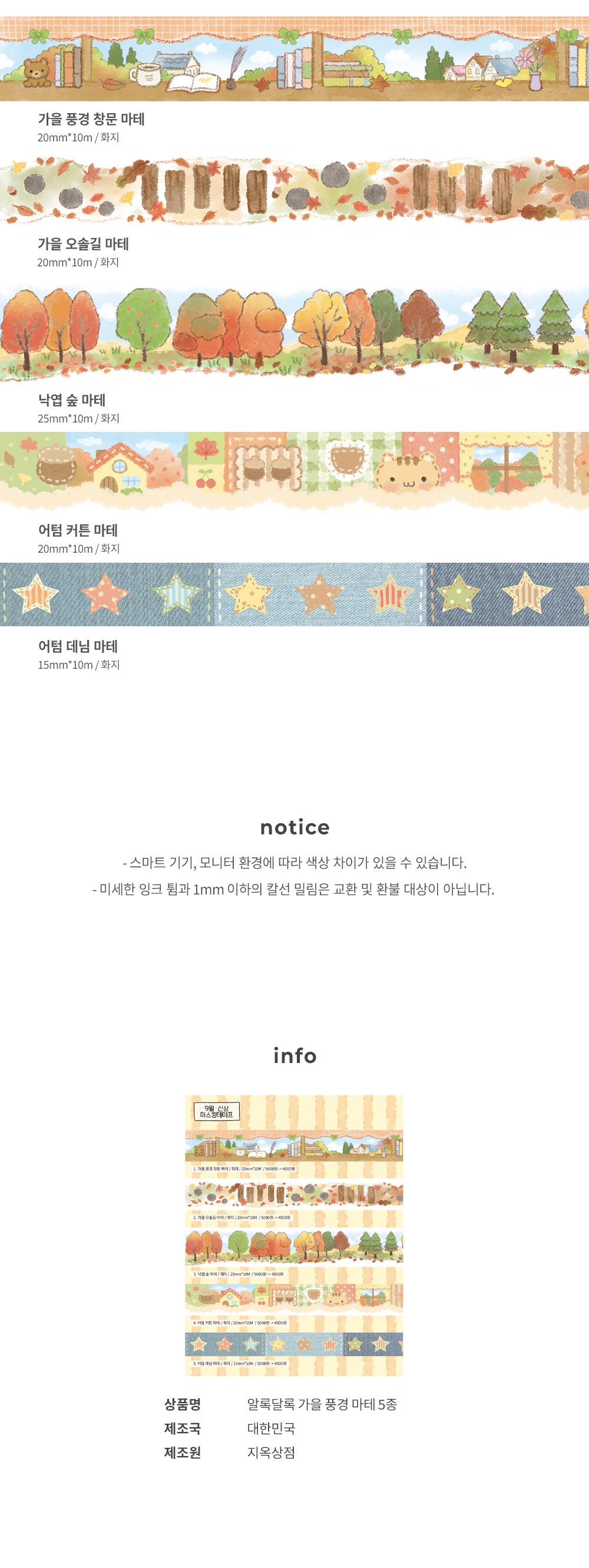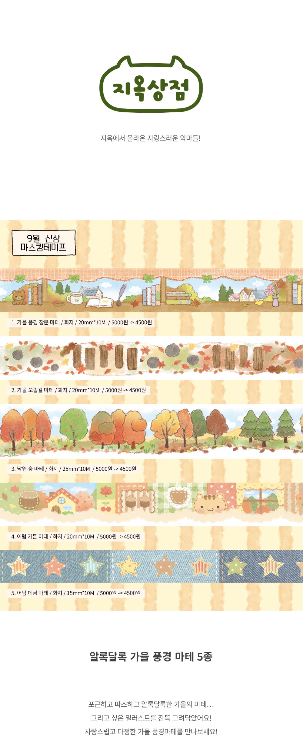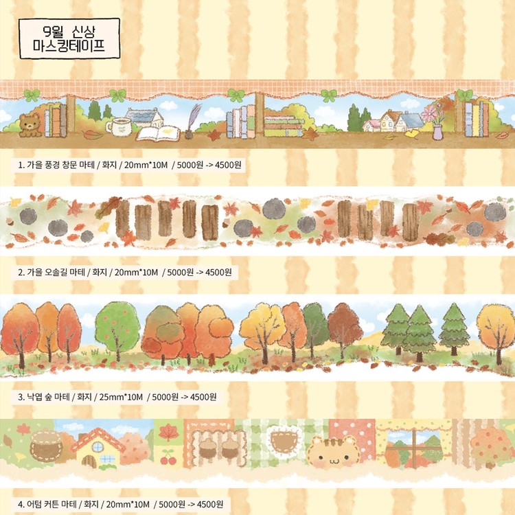 지옥상점 | 알록달록 가을 풍경 마스킹테이프 (5종)-가을풍경창문 / 가을오솔길 / 낙엽숲 / 어텀커튼 / 어텀데님