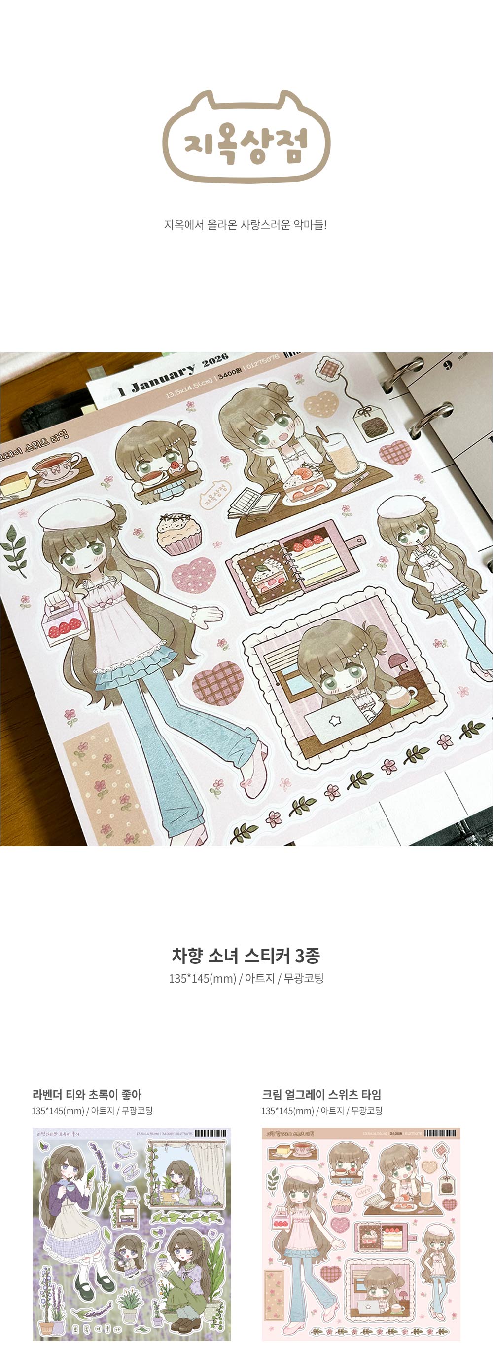 지옥상점 | 차향소녀 스티커 (3종)-라벤더 티와 초록이 좋아 / 크림 얼그레이 디저트 타임 / 우롱 니트 하우스